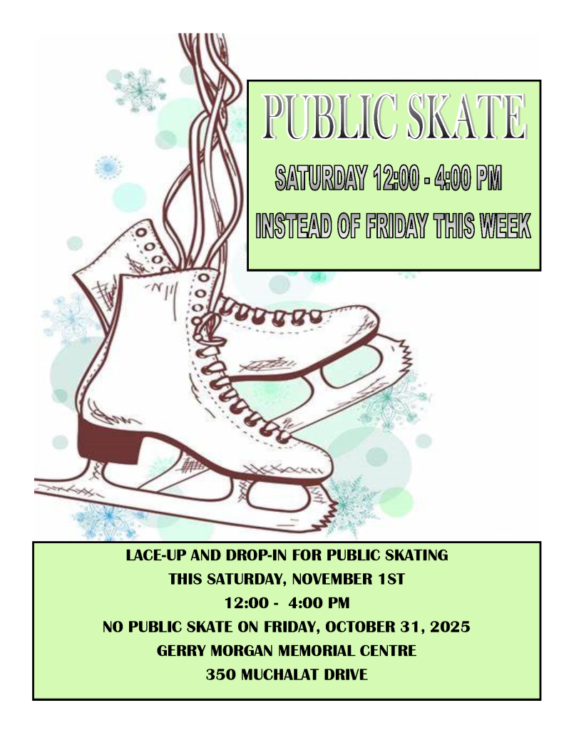 Public Skating is Cancelled for Friday October 31, 2025 instead Public Skating will be on Saturday November 1, 2025 Noon to 4:00pm